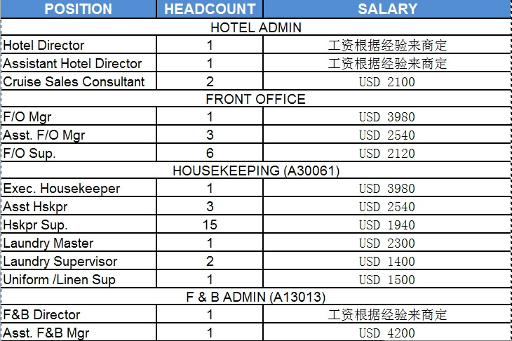 底薪:1000-3000美金以上,根據(jù)形象氣質(zhì),英語水平和工作經(jīng)驗定崗。