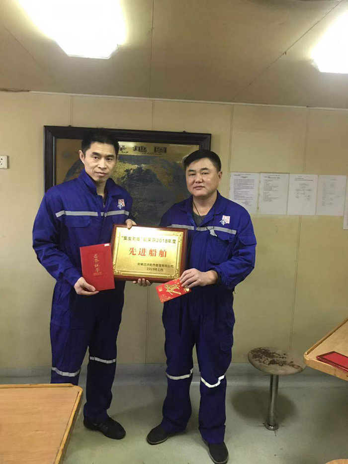 2018年度先進船舶集發(fā)渤海輪船長趙淑寧、輪機長魯友元在船接受2018年度先進船舶獎牌,集發(fā)渤海輪是公司2018年新接船舶,該輪接船后,船舶管理走向正規(guī),船舶風貌得到極大改變。